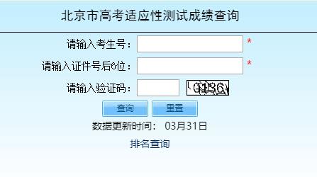 北京市高考适应性测试成绩查询系统https://www.bjeea.cn/ 雨竹林学习网(25-11-02) 雨竹林学习网小编整理分享北京市高考适应性测试成绩查询https://www.bjeea.cn/ 北京教育考试院首页 | 网上综合查询系统 | 高考成绩查询 您当前的位置: 网上综合查询系统 >>高考成绩查询 北京市高考适应性测试成绩查询 请输入考生号: 请输入证件号后6位: 请输入验证码: 数据更新时间: 03月31日 排名查询 版权所有:北京教育考试院,未经同意,请勿转载! 通信地址:北京市海淀区志新东路9号 邮政编码:100083